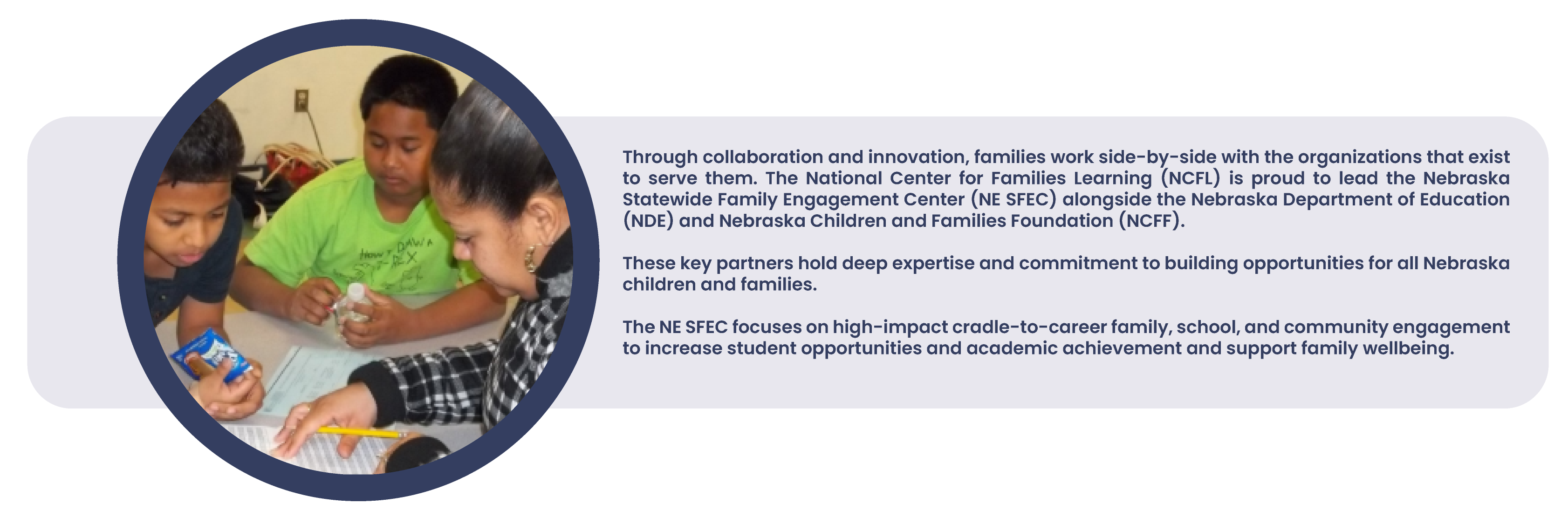 The National Center for Family Learning (NCFL) is proud to lead the Nebraska Statewide Family Engagement Center (NE SFEC) in conjunction with the Nebraska Department of Education (NDE) and the Nebraska Children and Families Foundation (NCFF). These key partners have extensive experience and a commitment to creating opportunities for all Nebraska children and families.